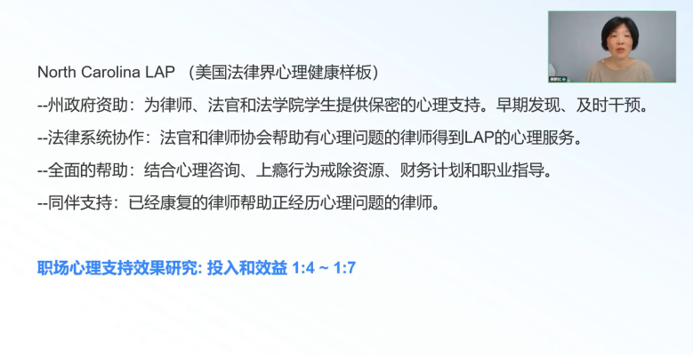 再往前推进,美国一些州政府也直接介入,比如北卡罗来纳州的LAP(Lawyer Assistance Program),他们的州政府出资为律师、法官和法学院的学生提供保密的心理支持。这个项目的核心作用是早期发现、早期干预,法律系统内部会协调资源,法官和律师协会一起帮助有心理问题的律师,提供心理咨询、成瘾治疗、职业规划,甚至财务指导,确保他们能够康复并回归职场。