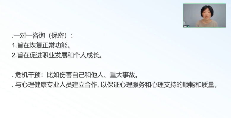 长期来看,我们还需要推动一对一的心理咨询服务,当然必须确保咨询过程的保密性。心理咨询不仅仅是帮助心理失调的个体恢复正常功能,更重要的是促进职业发展和个人成长。很多人误以为心理咨询只是针对抑郁症、强迫症等问题,但实际上,它在认知调整、情绪管理和行为优化方面有重要作用,可以帮助法律从业者更好地发展职业生涯。