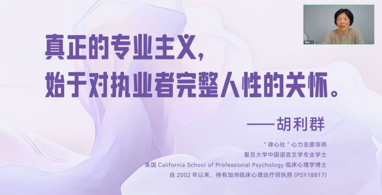 根据2025年公开信息显示,截至3月19日,今年已有20余位律师离世,年龄集中在35-67岁之间,平均年龄不到50岁。虽然信息显示,多位律师因突发疾病猝亡,但不容忽视的是,身心健康失衡是导致疾病的重要因素。 律师行业作为高压职业的典型代表,其身体和心理健康问题长期隐于“强者人设”之下,成为制约职业发展与个体幸福的关键隐患。尤其是心理健康问题,从职场竞争、道德困境到共情疲劳,心理失调不仅侵蚀职业效能,更为身体健康埋下隐患。律师心理健康已非个体议题,而是关乎行业可持续发展与社会法治生态的重要命题。唯有打破沉默、整合资源、推动系统性变革,方能为法律人筑起抵御高压的“心力防线”,让专业主义与人性关怀真正同行。 为帮助更多法律职场人士打开心门、获得心力,律新社联合多家机构及“心力”研究人士发起的“心力”加油站——“律心社”特别策划推出“职场心力课开心30讲”系列直播课程。首期邀请到“律心社”心力志愿导师、美国洛杉矶加利福尼亚职业心理学学院临床心理学博士胡利群做客“律新V品”直播间,胡利群博士从事心理健康工作已有20余年,她专注各年龄段各种精神及心理障碍,且有在医院、诊所、学校工作的经验。 在本次直播中,她深入分析了中美律师的心理健康状况及应对措施,在美国,70%的律师存在心理困扰。孤独感在律师群体中尤其突出,他们无法真正与人建立深层次的情感连接。她建议建立中国律师心理健康服务体系、在律所建立危机干预机制等相关举措。律新社特将胡利群博士的分享内容整理如下: