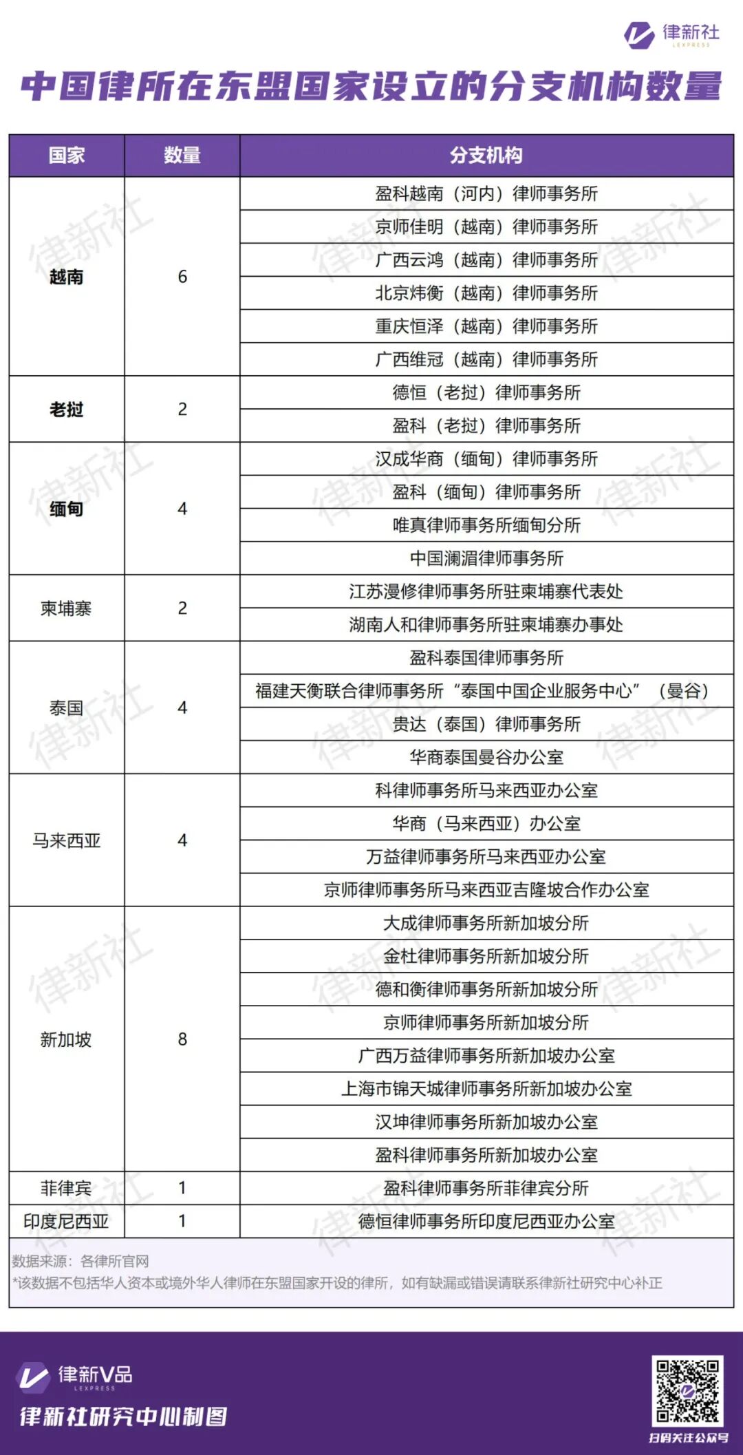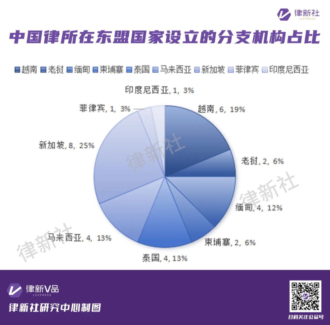 随着RCEP协定全面生效及全球供应链重组加速,东盟市场正成为法律服务机构的战略必争之地,跨境法律服务的东盟战场也已从“机会性试探”转向“系统性深耕”。据律新社研究中心统计的数据显示,目前中国律所的属地化布局已呈现差异化路径。除依托华人律师网络的传统合作模式外,已有众多中国律所通过直投、联营或分支机构形式完成初步布局,其中32家律所在越南、老挝、缅甸、柬埔寨等东盟国家中设立分支机构(详情见表1),覆盖RCEP协定国中90%的东盟成员国。