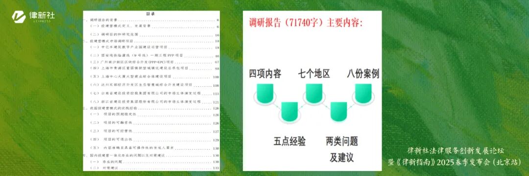 为系统解决上述问题,建纬与华东政法大学联合成立了投资与建设法治研究院。研究院的核心研究方向聚焦于投资与建设领域的法治实践,目前正着手启动一项重要课题——起草中国投资建设总承包合同的示范文本。在前期筹备阶段,研究院已于2024年6月启动专项调研,并针对国内投资建设模式的实践运作形成了一份翔实的调研报告。报告以“大江南北新涌动”为题,覆盖全国8个典型投资建设总承包项目,系统梳理了当前市场涌现的新型投融资模式,深入分析了实践中的经验与问题。调研发现,其中最突出的矛盾在于目前国内外均未形成标准化合同范本。
