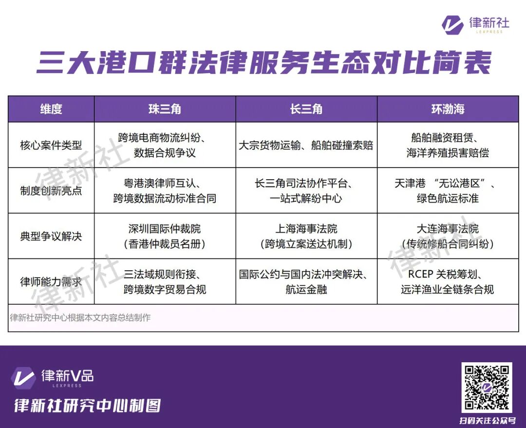 作者丨律新社研究中心研究员 Zoe 出品丨律新社研究中心 港口经济的每一次跃升,都踩在海事海商法律服务坚实铺就的阶梯上。 在全球产业链深度调整与国内“双循环”新发展格局构建的历史交汇期,港口经济已从传统货物集散枢纽升级为国家战略资源配置的核心节点。2023年我国海港城市港口经济增加值达6.2万亿元,占城市经济总量的13.4%,形成以上海、苏州为“一核”,长三角、珠三角为“两区”,环渤海、东南沿海、西南沿海为“多片”的空间发展格局。1 港口经济的结构性演变不仅重塑了航运物流的物理空间,更催生了跨法域、跨产业、跨技术的法律服务需求矩阵。当上海港以5150万标准箱的年吞吐量连续15年全球第一,当粤港澳大湾区凭借“一国两制三法域”制度优势推动跨境海事纠纷解决机制创新,当山东沿海港口依托大豆、橡胶等大宗货物贸易形成独特法律争议图谱……港航经济与海事海商法律服务业的互动关系已进入深度重构期。在此背景下,解构区域法律服务生态的差异化演进路径,成为海事海商律师把握港航经济法治需求脉搏的关键切入点。 2025年4月,律新社研究中心正式启动《精品法律服务品牌指南(2025):海事海商领域》调研。立足粤港澳大湾区、长三角、环渤海三大核心港口经济带,律新社研究中心通过调研六位资深海事海商律师,结合行业数据剖析三大港口群法律服务生态图谱,并聚焦实务难点,揭示区域特征对律师业务的重塑作用,为构建与国家战略匹配的港航法律共同体提供行动路线图。 港口经济是海事海商发展的物质根基,通过提供基础设施与综合服务,成为支撑行业运行的核心载体。作为国际贸易关键节点,港口承担货物装卸、仓储转运等基础职能,直接影响航运效率与成本控制。以上海港、宁波舟山港为例,两地依托深水航道与智能化设备升级,持续提升货物吞吐能力,为国际海运业务提供坚实支撑。 为支持港口经济发展,我国政府先后出台《全国沿海港口发展战略》《长江三角洲、珠江三角洲和渤海湾三个区域沿海港口建设规划》《全国沿海港口布局规划》《全国内河航道与港口布局规划》《国务院关于支持沿边重点地区开发开放若干政策措施的意见》等政策文件(见下表),持续推动港口资源整合与发展格局优化升级。相关政策支持有效促进港口经济产业结构升级、经济规模拓展,为未来港口经济的高质量发展构建了坚实的保障体系。 在系列政策引导下,我国港口经济实现集约化发展,沿海已形成三大港口群协同格局,分别是以上海港为核心,宁波港、连云港港、大丰港、南通港、张家港港为辅助的长江三角洲港口群;以大连港、天津港、青岛港为核心,营口港、秦皇岛港、烟台港为辅助的环渤海港口群;以香港港、广州港、深圳港为核心的珠江三角洲港口群。 从产业协同来看,港口经济的联动效应尤为显著。临港工业集群、物流园区及航运服务业目前已构成完整产业链,为海事海商创造多元业务场景。其中,青岛港推进智慧化改造,带动航运服务业数字化转型,正是港口经济赋能海事服务升级的生动体现。此外,港口经济借助贸易流量增长与区域一体化发展,不断拓展海事海商市场需求,为国际航线延伸与航运网络优化提供动能,凸显其作为海事海商发展核心载体的重要价值。 浙江海泰律师事务所权益合伙人、海事海商/国际贸易部主任 然而,港口集群的资源禀赋与法律需求深度咬合,正加速重塑中国沿海法律服务生态。从院校人才培养、区域专业分工到跨域协作实践,一幅以枢纽港为支点、海事规则创新为脉络、司法仲裁协同为韧带的动态生态图景已然显现。对此,浙江海泰律师事务所权益合伙人、海事海商/国际贸易部主任杨黎萍在接受律新社调研时表示,海事海商案件的地域分布与沿海港口城市及海事法院设置高度相关,主要集中在青岛、大连等北方港口,长江流域的南京、武汉、上海,以及宁波、厦门、深圳、广州等南方沿海城市。其中上海和广州的案件数量与质量处于第一梯队,宁波、福建、南京等属于第二梯队,武汉、青岛等则为第三梯队。在浙江区域,宁波因设有海事法院成为案件集中地,但复杂的船舶碰撞等疑难案件当事人多倾向委托上海、广州的专业律所代理,宁波、杭州等地更多处理海商类纠纷,尤其是伴随跨境电商发展,物流企业从传统海运订舱向包含海外清关、派送、仓储等全程服务转型,衍生出目的港费用,运输延误,清关责任等新型纠纷案件,此类案件近年在宁波地区的数量增长显著。 1.珠江三角洲港口群:跨境规则创新的前沿试验区域 珠江三角洲港口群以香港港、广州港、深圳港为枢纽,是粤港澳大湾区国际航运功能的核心载体。作为具有独立区位优势的港口,粤港澳大湾区在跨境海事法律协作方面始终走在全国前列。近年来,粤港澳大湾区以“软联通”为核心目标,着力构建跨境法律服务新生态。粤港两地签署《政务服务“跨境通办”合作协议》,建立在线数字身份互认体系;横琴自贸区出台全国首部商事调解地方性法规,南沙自贸区实现大湾区律师代理内地案件的历史性突破。截至2024年,广东全省累计落户外商投资企业超过2.5万家,同比增长19.13%,充分体现规则创新对国际投资的强大吸引力。2 其中,深圳前海通过设立粤港澳大湾区涉外律师学院,积极推动港澳及国际法律专业人士参