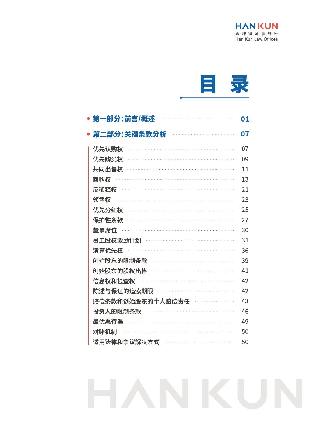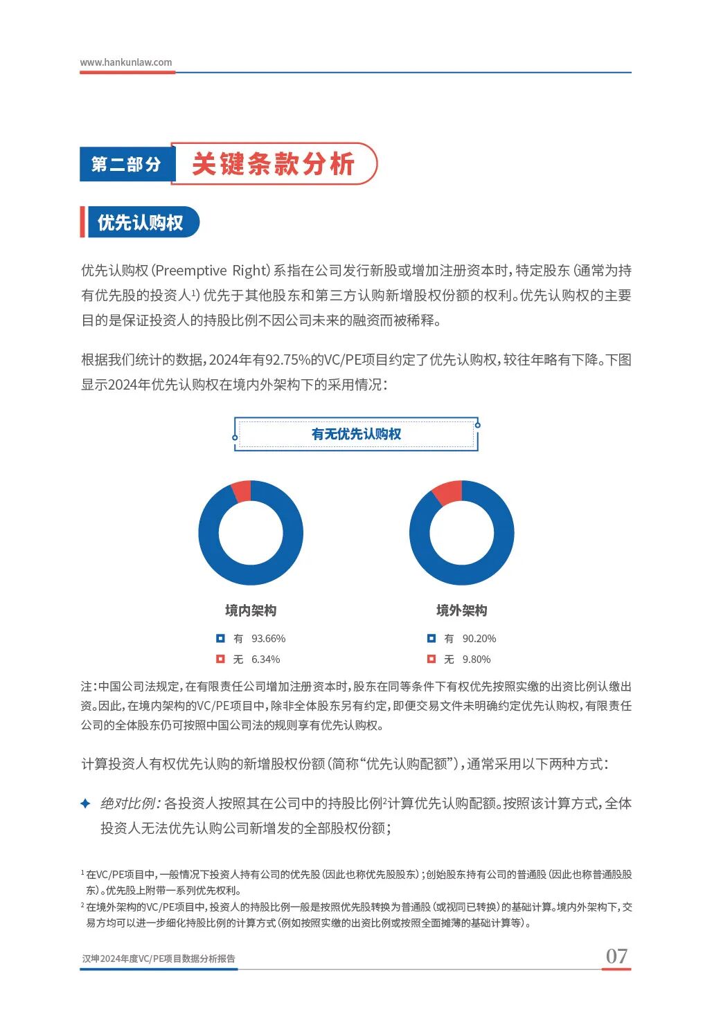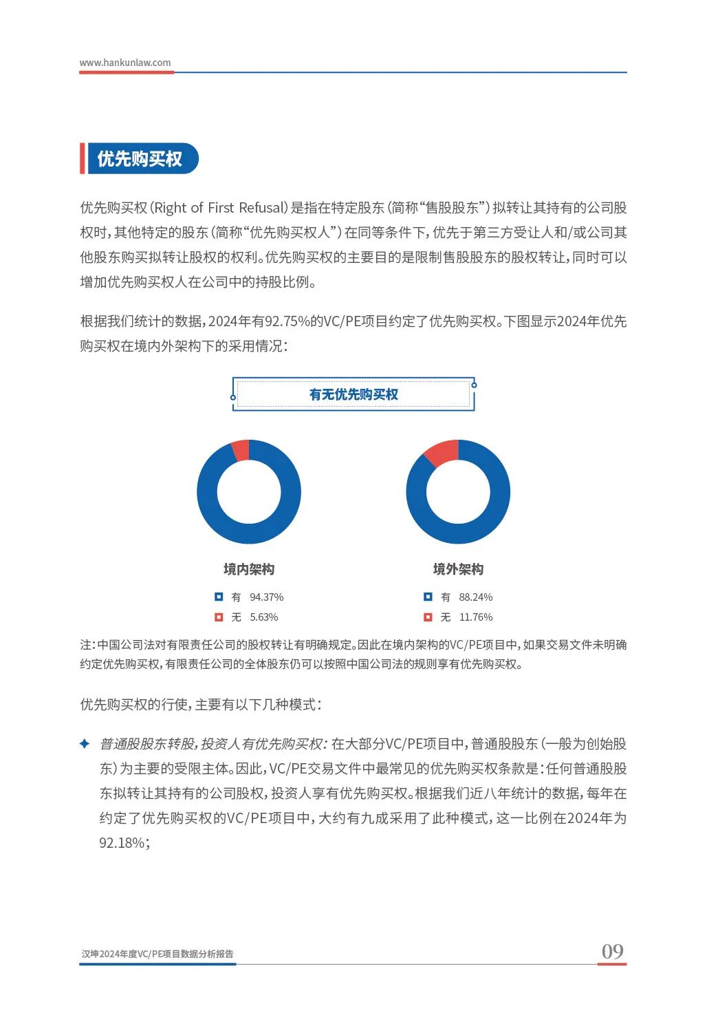 报告第二部分重点对VC/PE项目中多个关键法律条款进行了梳理和解析,归纳总结近几年的变化趋势。这些条款包括:优先认购权、优先购买权、共同出售权、回购权、反稀释权、领售权、优先分红权、保护性条款、董事席位、员工股权激励计划、清算优先权、创始股东的限制条款、创始股东的股权出售、信息权和检查权、陈述与保证的追索期限、赔偿条款和创始股东的个人赔偿责任、投资人的限制条款、最优惠待遇、对赌机制、适用法律和争议解决方式。