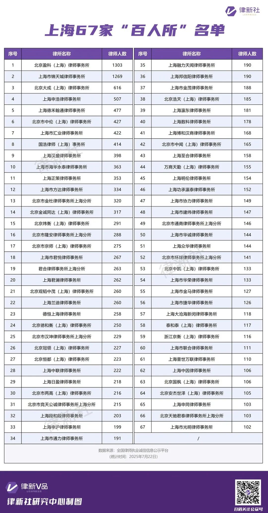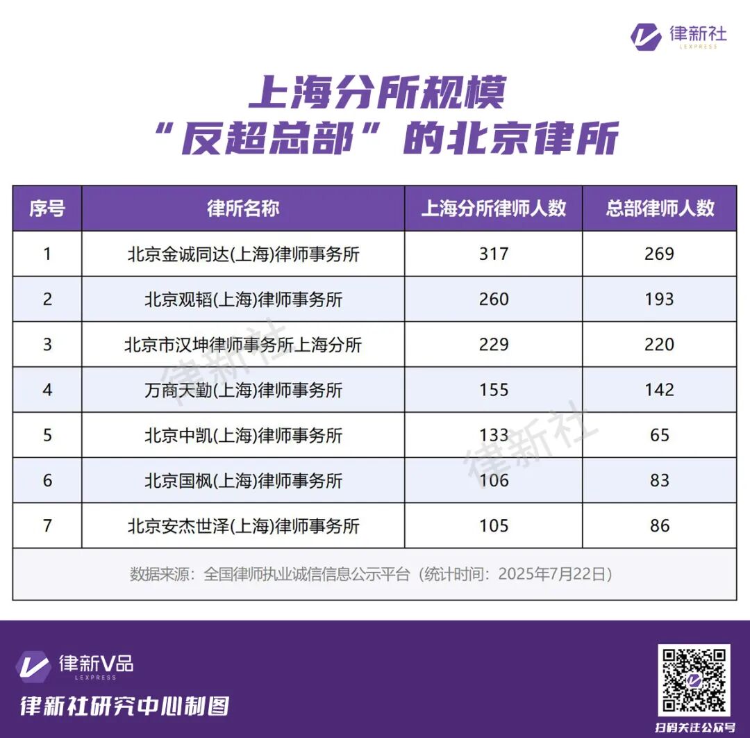 在历史积淀与现代活力交融的黄浦江畔,法律市场格局在持续动态演进中呈现出崭新面貌,也始终彰显着开放包容的“海派基因”。 2025年6月23日,上海市律师协会发布的《2024年上海律师行业大数据报告》显示,截至2024年底,全市共有律所1999家,同比增长4.55%。其中,上海市百人以上规模律所的快速增长尤为引人注目,反映出行业规模化发展趋势的加速。律新社研究中心根据全国律师执业诚信信息公示平台的数据分析发现,截至2025年7月22日,上海市百人所数量已达67家,在全市2048家律所中占比3.27%。其中值得注意的是,北京律所分所的数量已占上海百人规模律所的37.3%(25家)。这场由市场需求与人才流动共同驱动的规模角逐,正加速推动上海法律服务市场的资源整合。在上海建设国际法律服务中心的战略背景下,法律服务市场正迈向更高质量的发展阶段。 ➢ 头部律所虹吸效应显著,市场集中度持续提升 ➢ 京沪法律服务品牌深度融合,协同发展格局形成 ➢ 出现上海分所规模“反超”北京总部现象 随着中国法律服务市场规模化浪潮的推进,越来越多律所跻身“百人所”行列,行业竞争日趋白热化,作为中国法律服务高地的上海自然身处潮头。凭借深厚的法治积淀和强劲的经济发展动能,上海律师行业持续领跑全国,其执业律师规模长期稳居全国第二位。上海市律协数据显示,截至2024年底,上海市律师队伍稳步增长,共有律师44,477人,其中执业律师38,866人,同比增长7.25%。律所数量增速不减,共有律所1,999家,同比增长4.55%;规模化趋势初显。 与此同时,上海百人以上律所近年来保持稳健增长的速度。2023年上海有55家百人所,到2024年底已增至63家,年增长率为10.53%,这一增长速度明显高于律所总数4.55%的增长率,这表明资源正在加速向规模化律所集中。律新社研究中心根据全国律师执业诚信信息公示平台数据统计,截至2025年7月22日,上海百人所数量更是已跃升至67家。 从人数占比看,百人所的律师人数占全市比例从2023年的34.49%上升至2024年超过40%,显示出律师职业选择明显向大所倾斜。尤其值得注意的是,在规模化浪潮下,上海孕育出2个“千人所”巨头:北京盈科(上海)律师事务所、上海市锦天城律师事务所执业律师均已突破千人规模。同时,北京大成(上海)律师事务所、上海申浩律师事务所、上海德禾翰通律师事务所、北京市中伦(上海)律师事务所、上海市汇业律师事务所、国浩律师(上海)事务所等6家律所的规模也均达到400人以上,形成了明显的头部效应。此外,上海汉盛律师事务所、上海市海华永泰律师事务所、上海正策律师事务所、上海市方达律师事务所、北京市金杜律师事务所上海分所、北京金诚同达(上海)律师事务所6家律所人数已超300人,正向400人门槛迈进;北京炜衡(上海)律师事务所、北京市隆安律师事务所上海分所等18家律所规模突破了200人;余下的35家跻身“百人所”的律所规模差距相对较小,也从侧面反映出上海规模化律所竞争的激烈态势。 2021年6月11日,上海市司法局发布《上海司法行政“十四五”时期律师行业发展规划》,明确加强律师人才队伍建设,健全完善律师人才体系,并计划到2025年,全市拥有50名律师以上的大中型律所达到100家左右,100名律师以上的规模所达到60家。目前来看,这个目标已超速完成。上海规模大所数量众多、实力雄厚,集中度高,是全国领先的规模化中心,2025年1月,国内百人所数量达到615家,上海百人所数量就占到了10%。同时,在庞大的基数上,上海律师人数仍保持显著高于全国平均水平的增长率,持续扩大其领先优势。可见,上海作为中国法律服务规模化、高端化、国际化发展的核心引擎与标杆城市,其“百人所”“千人所”的蓬勃发展态势,正是这一独特地位最有力的注脚。 上海作为长三角龙头和经济金融中心,其高度发达的开放型经济催生了海量的跨境投融资、企业出海和科技创新等高端法律服务需求。北京律所在沪设立分所,能高效承接此类业务。此外,2023年12月29日,上海市人民政府办公厅印发《发挥城市功能优势 做强律师事务所品牌 加快推动上海国际法律服务中心建设的若干措施》通知,明确提出要“吸引优质律所来沪兴业”,打造“上海国际法律服务中心”,支持外省市律所在沪设立运营管理中心或通过合并实现强强联合,并给予办公用房补贴、人才引进奖励等扶持。例如,虹口区主动对接京师律所,将北外滩定位为“全球资源配置窗口”,与律所国际化战略深度契合。 全国律师执业诚信信息公示平台数据显示,在上海现有的67家百人所中,有40家是本土品牌律所。此外,除了泰和泰(上海)律师事务所、浙江京衡(上海)律师事务所,剩余25家均是总部在北京的京派品牌,分散于浦东新区、虹口区、静安区等多个市内区域。这种分布格局体现了北京与上海法律服务资源的深度链接:北京作为全国法律政策中心和央企总部聚集地,拥有强大的品牌资源和专业积淀;上海则依托国际金融中心、自贸区制度创新等优势,成为北京律所对接国际业务的关键支点。 以上海TOP 10规模所为例(截至2025年7月22日),有3家为北京律所的上海分支机构,分别是北京盈科(上海)律师事务所、北京大成(上海)律师事务所、北京市中伦(上海)律师事务所。据统计,这三家分所的律师总人数达到了2346人,占据上海TOP 10规模所总律师数的37.8%。其中,北京市中伦(上海