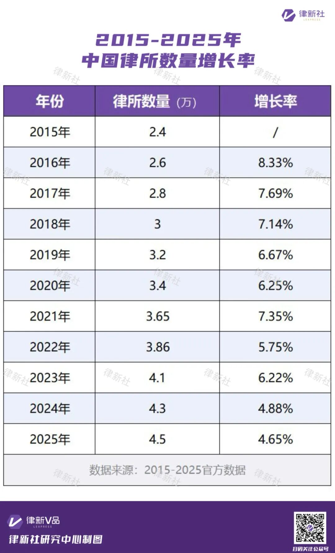 2025年9月8日,国务院新闻办公室举行“高质量完成‘十四五’规划”系列主题新闻发布会透露,目前我国律师达83万人,律师事务所4.5万家。这一消息备受业内外关注,律师行业的人数增速与市场竞争度成正比。 律新社研究中心通过检索近10年中国律师人数增长率发现,2015年律师人数为29.7万人,到2025年已达83万人,十年间增长近1.8倍。其中2018年增达到峰值15.89%,随后逐年回落,2025年增速降至3.75%。这一变化趋势表明:中国法律服务行业经历了快速扩张期后,正逐步进入稳定发展阶段。前期的高速增长反映了法治中国建设背景下法律服务的需求爆发和市场扩容,而近年的增速放缓则预示着行业从数量扩张向质量提升转型,与司法部提出的行业专业化、规模化发展趋势相吻合。 与此同时,结合近年来法律服务行业观察可以看到,行业分化组合加剧,律师人数向头部规模所聚拢,加速海内外布局成为当前发展的重要规划,从大所到强所成为高质量发展的确定性目标: 83万执业律师、4.5万家律所构筑起专业服务的中坚力量; 633家百人规模所、6家千人规模所彰显行业集中化与专业化提速; 37个国家/地区设立207家海外分支机构则标志着中国律所服务国家高水平对外开放的坚定步伐。 法律服务队伍建设的高质量发展离不开“十四五”期间的系统性规划。根据会上披露的数据,我国当前已形成包括83万律师、6.7万仲裁员、1.5万公证员、4万司法鉴定人在内的专业化法律服务队伍。对比历史数据,2020年全国律师人数为52.2万,过去五年净增30.8万人,增幅达59%,远超“十三五”(2016年-2020年)期间42.5%的增长率[1]。值得注意的是,法律职业资格考试客观通过率2024年保持在13%左右,但报考人数从2020年的68.9万增至2024年的96万。会上数据显示,“十四五”以来,有60多万人取得了法律职业资格,反映出近年来越来越多的人才涌入法律服务行业[2]。 从律所角度来看,中国律所数量近十年保持稳定增长态势,从2015年的2.4万家增至2025年的4.5万家,但增长率总体呈现波动趋势,从2016年的8.33%至2025年的4.65%。这一变化表明中国法律服务行业已从早期的高速扩张阶段进入稳健发展期,在规模持续扩大的同时,正从追求数量增长转向质量提升和结构优化,与律师人数的增长趋势相呼应,共同反映出行业日趋成熟的发展特征。 在结构优化方面,专职调解员数量五年增长29%至47万人,310万人民调解员五年调解纠纷7900多万件,年均调解纠纷超1500万件。会上数据指出,目前,全国司法所共有3.9万个,实现了乡镇(街道)全覆盖。“十四五”期间,全国司法所每年调解矛盾纠纷800多万件,解答群众法律咨询2950万人次,在促进基层依法治理、维护社会安全稳定中发挥着重要作用。 与此同时,司法部会同有关部门对全国625所法学院校负责人进行全覆盖集中培训,常态化举办“中国法治实务大讲堂”,法学院校师生共68万人次参加。司法部创新实施青年律师下基层锻炼计划,选拔1000名西部青年律师到东中部学习,组织两批近600名青年律师到西部法律服务机构锻炼。这种双向交流机制有效缓解了法律服务资源分布不均的问题。 律所规模化发展呈现加速度态势。根据律新社研究中心调研,尤其是近5年来,百人所的增长速度不断加快:2019年,百人所数量约320家,占全国律所总数的0.99%;截至2025年9月8日,百人所数量达到633家,占全国律所总数的1.4%。百人所数量的发展是中国法律服务行业发展的一个缩影和晴雨表。它清晰地揭示了行业发展与区域经济的强关联性、以及未来的巨大潜力。 中国律所的规模化发展呈现出极其明显的地域集中性。表格中的数据可以看出: 广东省 (101家)作为中国经济第一和律师数第一大省,以绝对优势位居榜首。这充分体现了珠三角地区巨大的经济活力、密集的民营企业、频繁的对外贸易以及粤港澳大湾区的联动效应,对高端、规模化法律服务有着海量的需求。 北京市 (72家)作为国家首都、政治中心和国际交往中心,聚集了众多央企总部、大型金融机构、顶级跨国公司以及大量的国家机关和事业单位,是高端商事法律业务和争议解决的核心市场。 上海市(68家)作为中国的金融中心和国际化程度最高的城市,资本市场、金融衍生品、跨境投资并购等高端法律服务需求极其旺盛,吸引了大量国内外顶尖律所落户。 江苏省 (39家)、浙江省 (36家)、山东省 (35家)、河南省 (30家)、四川省 (25家)、陕西省 (26家)。这些省份都是经济大省或区域中心,拥有强大的省会城市(如南京、杭州、成都、西安)和活跃的民营经济,法律服务市场成熟且需求旺盛。 包括天津、河北、安徽、福建、湖北、湖南、重庆等。这些省市的经济和法律服务市场处于稳步发展阶段,有一定数量的规模化律所。此外,在西部、东北和部分经济欠发达省份,如黑龙江、吉林、甘肃、广西、云南、贵州、宁夏等。这些地区的法律服务市场主要以中小型所为主,解决本地传统诉讼和非诉业务,规模化大所的需求和供给都相对较少。 据中国法律服务网数据显示,截至2025年9月8日,全国单体律所中律师人数超过千人的共6家:北京有2家,北京市盈科律师事务所1406人、北京市京师律师事务所1207人;上海有2家,上海市锦天城律师事务所1270人、北京市盈科(上海)律师事务所1310人;广东有2家,北京市盈科(深圳)律师事务所1150人、华商律师事务所1097人。 从规模上看,盈科律师事